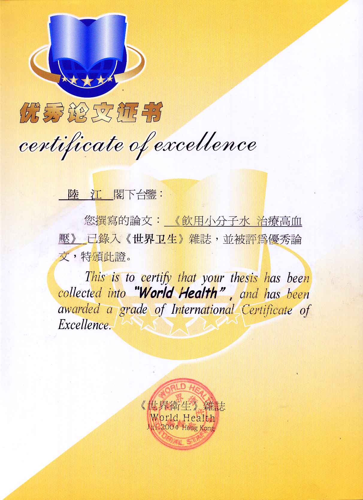 一.發明的亮點是中國基礎醫學研究成果的轉化醫學應用------------------------------------------------------------------------------------ 1990年春,我50歲,發現患了高血壓,便及時遵醫囑服藥。我想起父輩、祖輩曾患高血壓,后來都患中風癱瘓或心梗過世,所以心中壓力大。我夢想能根治高血壓,便研究醫學。當我檢索到中國基礎醫學研究成果,采用高脂餐和磁處理小分子團水飼喂小白鼠或大白免等兩組哺乳動物,經過2、4、6個月剖殺血檢,發現飼喂小分子團水的試驗組動脈內壁干凈,能減輕和延緩動脈粥樣硬化。我從這些研究成果受到啟發。覺得有責任研制出優良的器具,讓天下人能真正治愈高血壓,消除動脈粥樣硬化,延年益壽。于是,1990年我做成樣品,先后與愛人飲用兩三個月,分別治愈了高、低血壓,之后我們的血壓都正常,癥狀消失。該水經南京大學做核磁共振檢測為55.82赫茲的微小分子團水。該品經工業開發后,1994年送給廣西三家三甲醫院做臨床試用4個月,再經北京和廣西醫學專家鑒定認為:“降脂降壓效果好” ,“能擴大心腦動脈流量,改善心腦電圖和微循環” ,“對治療心腦動脈粥樣硬化、高血壓、高血脂有良好的醫療保健作用”。1996年產品獲得中國發明專利權。這就使產品可以轉化為醫學應用,人類可逐漸改變終生服藥,自己祛除病癥。