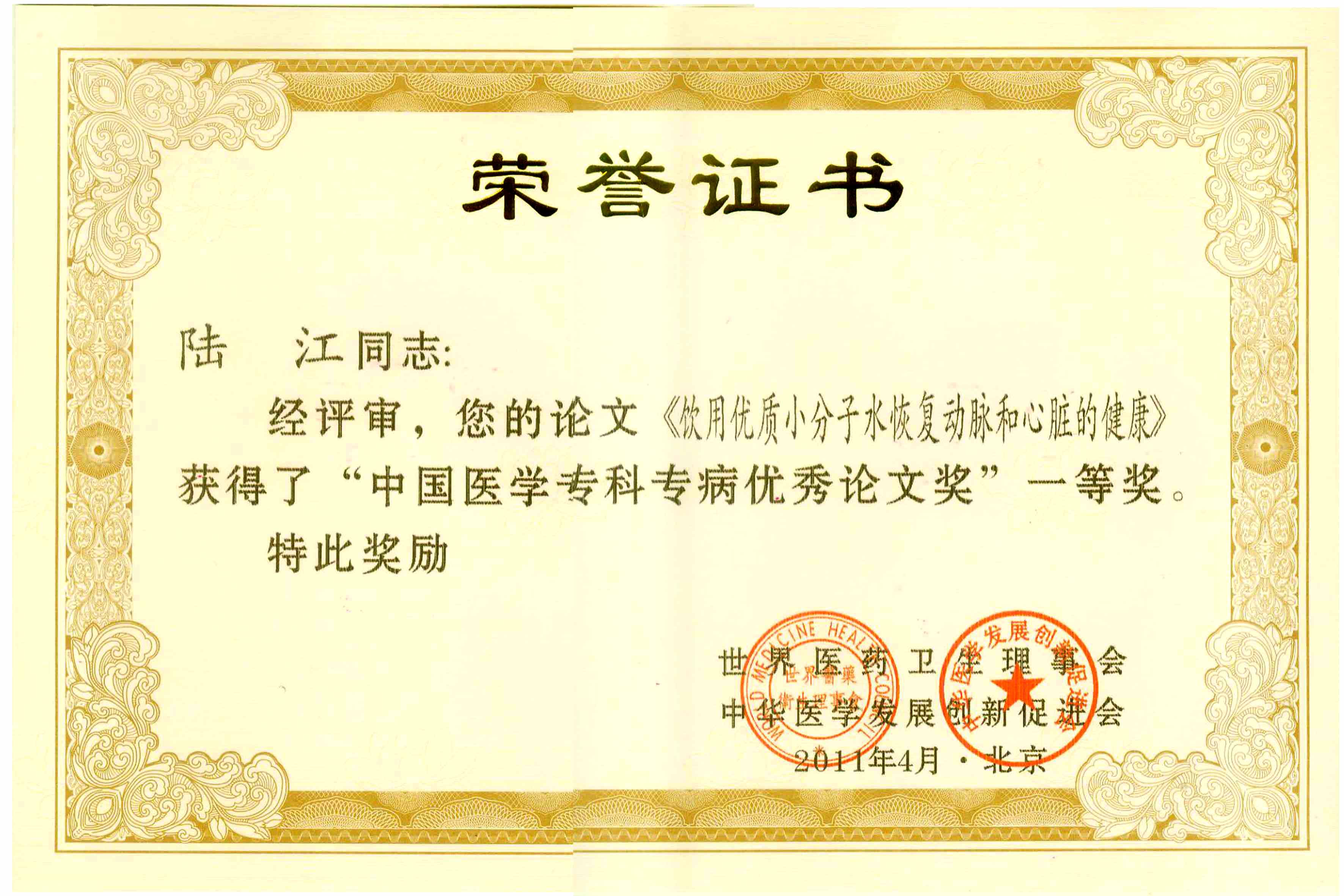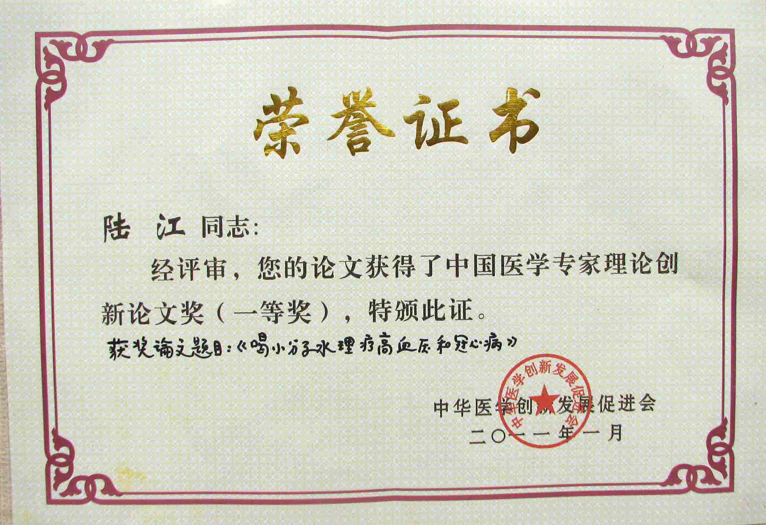 陸江的論文獲一等獎榮譽證書-- 陸江論文獲創新論文獎牌